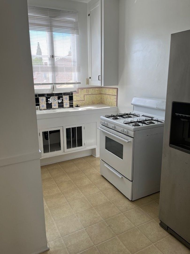 Great Unit W/ Lots of Features. Spanish Style Building W/ on-Site Laundry. Newer flooring in living area. This unit obtains a lot of natural light. Carpet in both bedrooms. This character-filled kitchen includes a stove, refrigerator and tile flooring. Two charming bathrooms. Unit sits above garages. Tenant pays gas, electricity, and refuse. No pets.
